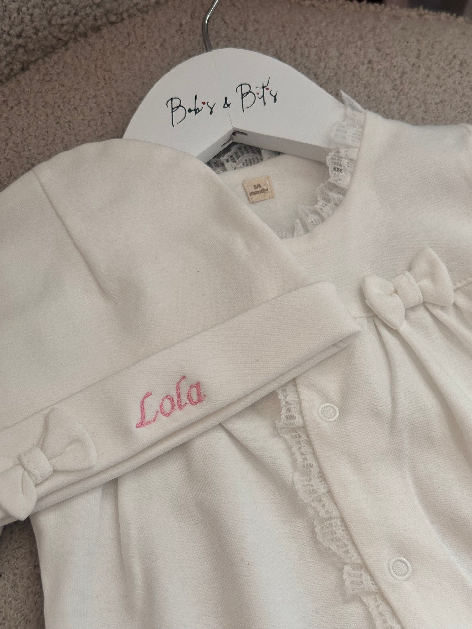 Cotton baby romper set with hat- floral bow design. This set is perfect for a baby girl and can be personalised and in any location. Embroidery colours are white, black, brown, baby blue, navy, pink, dusty pink, baby pink, green, yellow, green and red.
