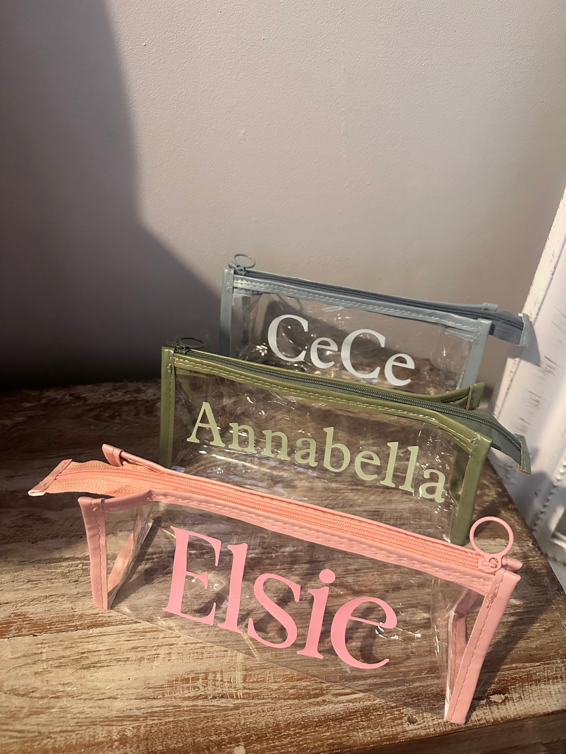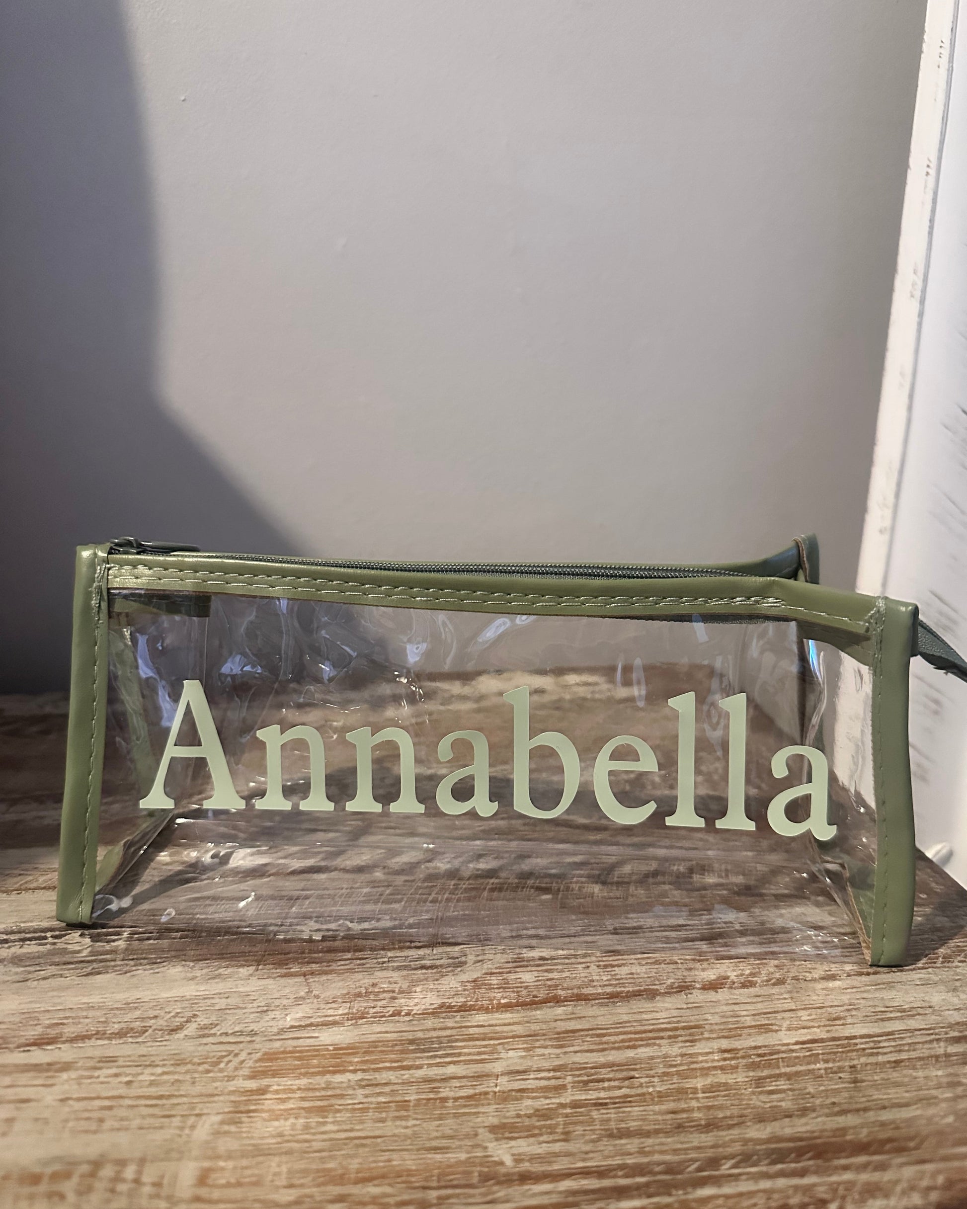 Children’s pencil cases, can be personalised with a name or a pencil image. Pencil cases come in Green, Blue, Pink & White.